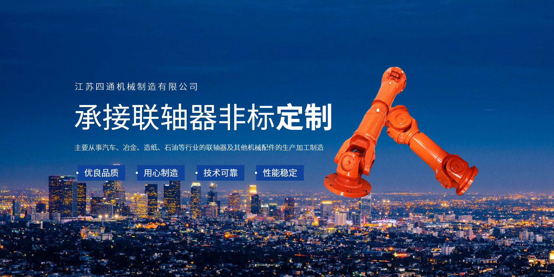 江蘇四通機械制造有限公司主要從事汽車、冶金、造紙、石油等行業的聯軸器及其他機械配件的生產加工制造,產品廣泛應用于冶金行業(十字萬向聯軸器、鼓形齒式聯軸器、球籠式萬向聯軸器、導衛裝置、鋼管頂頭);電力行業(耐熱耐磨鋼);船舶、機車、工程機械(混凝土泵車、挖掘機、壓路機、傳動系統);包裝機械、公司已有多年的研發和制造經驗,具有研發高新精產品和批量生產的優越條件及強大優勢。公司實現了ATUO CAD計算機輔助設計和信息化管理,集研究制造為一體,有豐富的制造經驗和雄厚的技術力量,檢測手段完善、品種規格齊全、質量穩定可靠,能滿足不同客戶的訂貨需求,產品具有質量優良、性能可靠,維護方便等特點,深受廣大用戶的信賴。公司位于江蘇江陰經濟開發區靖江園區內,緊鄰南京、揚州、常州、無水陸交通十分方便。我司座落在黃金水道的長江之濱,位于雄偉美麗的江陰長江大橋北岸,東臨京滬高速公路,北臨寧通公路,與上海、蘇州、無錫、南京等城市相鄰,地理位置優越,水陸交通十分便利。 公司主要產品為“冶金軋制設備、石油機械、橡塑機械、鋼管設備、造紙機械、汽車傳動、紡織機械、破碎機、新能源傳動”、SWC、SWP型萬向聯軸器、導衛裝置等各類非標機械加工。公司加工過程精益化,管理過程網絡化、信息化。產品出口美國、韓國及東南亞國家和地區。公司技術力量雄厚,采用CAD和proe計算機系統進行開發設計,有相當強的新產品開發能力,通過ISO/TS16949認證,有完善的質量保證體系。我們鍥而不舍,將長期致力于產業的提升,我們忠于使命,將質量和服務放在首位。熱忱歡迎國內外新老客戶來我公司視察指導工作、商洽、投資、合作!